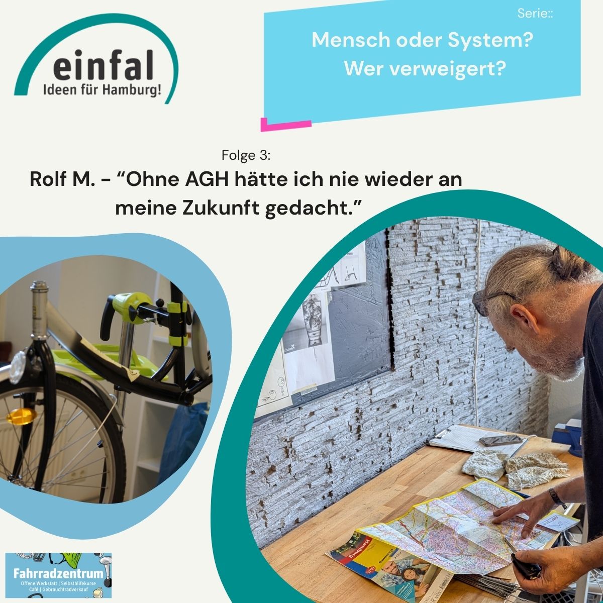 Das Fahrradzentrum Wandsbek der einfal gGmbH ist ein Beschäftigungs- und Qualifizierungsprojekt, in dem Teilnehmende in der Fahrradmontage, im Service und in begleitenden Aufgaben wie Fahrertätigkeiten neue berufliche Perspektiven entwickeln können.