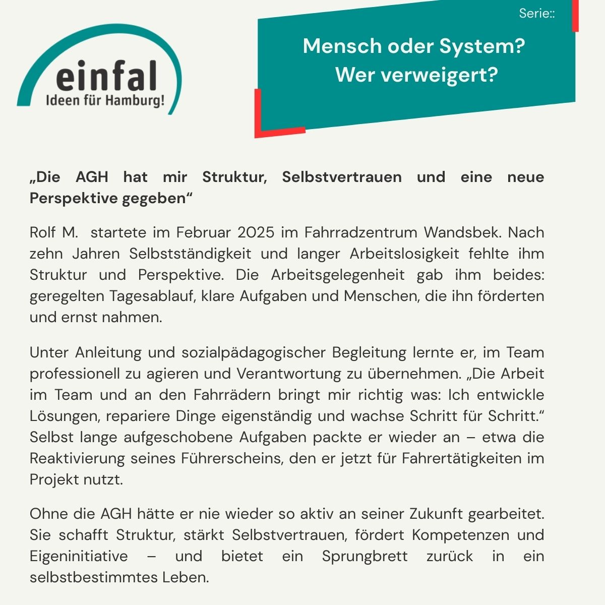 „Ohne die AGH wäre ich nie wieder auf die Idee gekommen, so aktiv an meiner Zukunft zu arbeiten“, betont Rolf M.