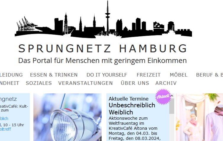 Auf www.sprungnetz.de veröffentlichen wir preisgünstige und kostenlose Angebote: Kleidung, Fahrräder, kulinarische Angebote oder Veranstaltungen. Wir sagen was, wann und wo in Hamburg für den schmalen Geldbeutel attraktive Angebote lauern!